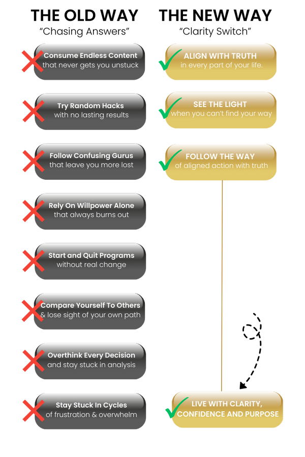 The Clarity Switch is a counterintuitive method for finding direction when everything feels foggy. Instead of chasing hacks or surface-level fixes, the Clarity Switch takes you inward: