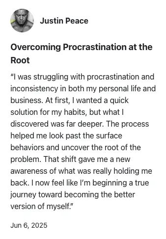 “I had been carrying mental and spiritual blocks that kept me from having the relationship I truly desired. Going through this process helped me uncover the patterns that were holding me back and reframe how I was approaching relationships. What stood out was realizing I didn’t have to keep repeating the same cycles—I could move forward with faith and confidence. I left feeling encouraged, with a clearer vision of the kind of relationship I want to build and the courage to pursue it.”