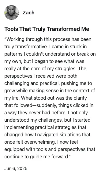 “I’ve struggled with anger most of my life, especially in my relationship with my wife. I would get triggered easily, and no matter how many therapists I saw, nothing ever created real change. That all shifted when I went through this process. For the first time, something truly clicked. The way I handle arguments and emotions completely changed, and I finally feel peace where I used to feel rage.”
