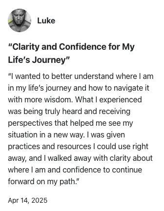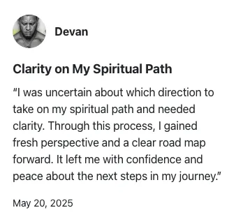 “I came seeking clarity about spirituality and the hero’s journey, and through just a few questions I was able to uncover the real root of my problem and recognize a deeper pattern in my life. The wisdom around the 12-year cycle gave me a clear sense of where I am and what I need to do next to stay aligned with my highest purpose. I left with actionable next steps and a much deeper understanding of my spiritual path.”